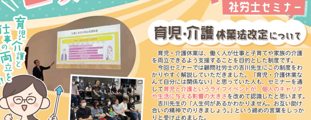 今年のセミナー内容は、ハラスメントに関する件と、育児介護休業制度に関するものがメインになります。両テーマとも従業員・会社にとって興味ある内容で、特に育児介護休業制度に関してはセミナー後の質問も多く「やってよかった」とわたくしの満足度も高いです。